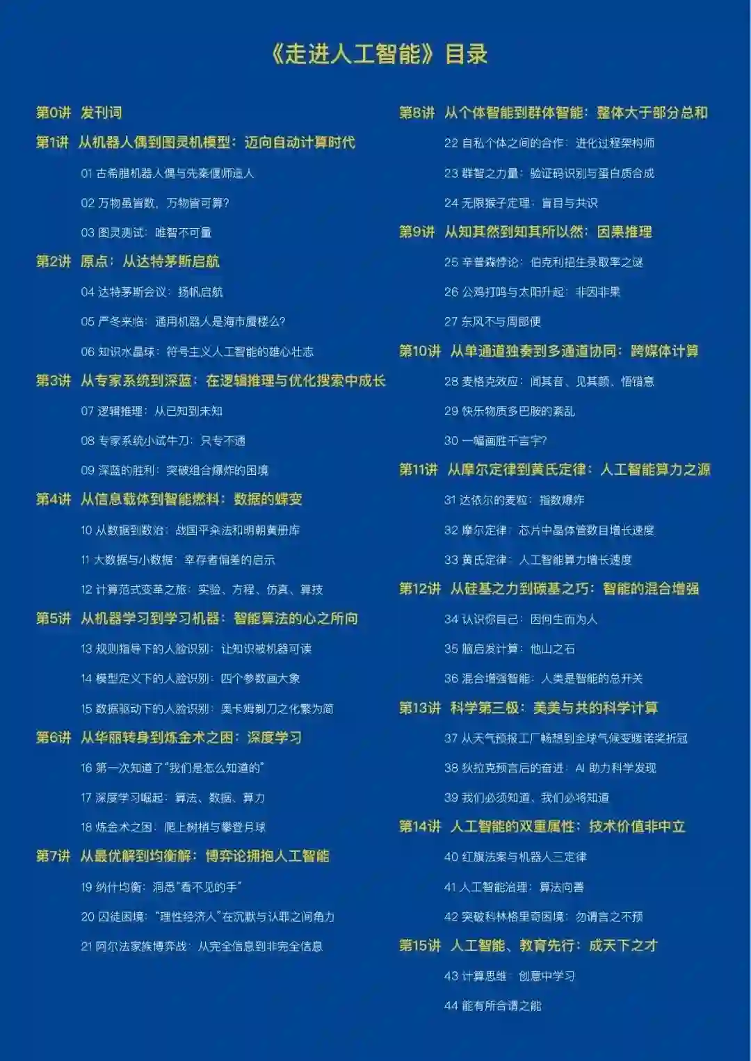 《走进人工智能》通识读物主要定位非人工智能、非计算机科学与技术领域的其他人士,尤其以青少年为重要覆盖群体。内容共计十五讲:(1)从机器人偶到图灵机模型:迈向自动计算时代;(2)原点:从达特茅斯启航;(3)从专家系统到深蓝:在逻辑推理与优化探索中成长;(4)从信息载体到智能燃料:数据的蝶变;(5)从机器学习到学习机器:智能算法的心之所向;(6)从华丽转身到炼金之困:深度学习;(7)从最优解到均衡解:博弈论拥抱人工智能;(8)从个体智能到群体智能:整体大于部分总和;(9)从知其然到知其所以然:因果推理;(10)从单通道独奏到多通道协同:跨媒体计算;(11)从摩尔定律到黄氏定律:人工智能算力之源;(12)从硅基之力到碳基之巧:智能的混合增强;(13)科学第三级:美美与共的科学计算;(14)人工智能的双重属性:技术价值非中立;(15)人工智能、教育先行:成天下之才。在内容层面,精简高质,取其精华,《走进人工智能》通识读物以“孕育、形成、发展”的路径梳理了人工智能的历史发展脉络,从“能”与“不能”的角度厘清了人工智能的核心技术方法,用“学科交融创新”的思路剖析了人工智能与其他学科研究碰撞,借“成天下之才”的底层逻辑提供了人工智能的学习建议。