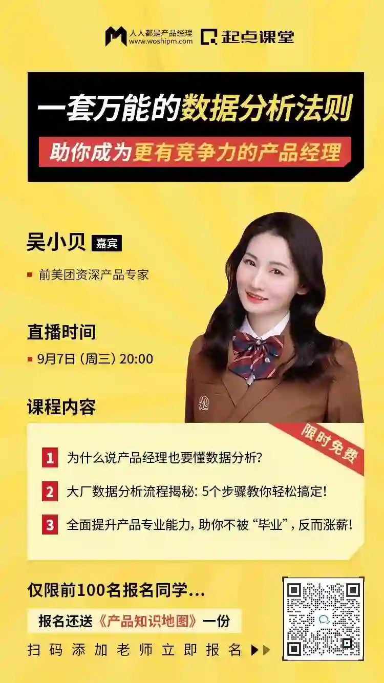 为了帮助大家解决数据分析难题,我们邀请了前美团资深产品专家@吴小贝老师直播授课,教给你一套万能的数据分析法则,助你成为更有竞争力的产品经理!