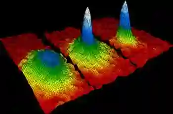 实验上实现的玻色-爱因斯坦凝聚,上图的峰代表大部分粒子都集中在一个状态上(图片来源:维基百科)