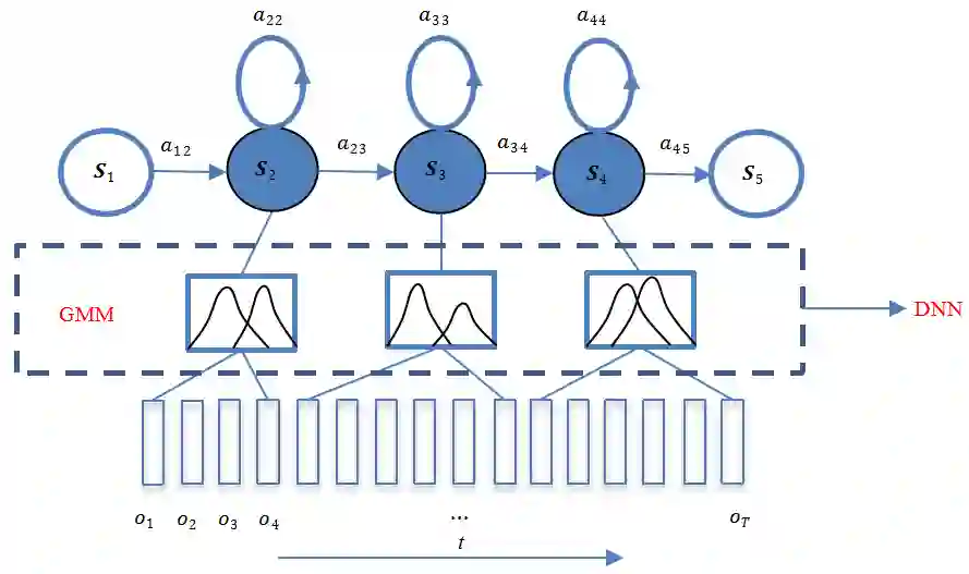 DNN拥有更强的表征能力,其能够对复杂的语音变化情况进行建模。把GMM-HMM的GMM用DNN替代,如图1-10所示,HMM的转移概率和初始状态概率保持不变。