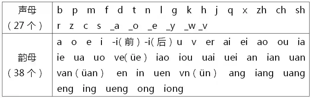 但普通话的韵母很多是复韵母,不是简单的元音,因此拼音一般分为声母 ( initial ) 和韵母 ( final )。汉语中原来有21个声母和36个韵母,经过扩充 ( 增加a o e y w v ) 和调整后,包含27个声母和38个韵母 ( 不带声调 ) ,如表1-1所示。