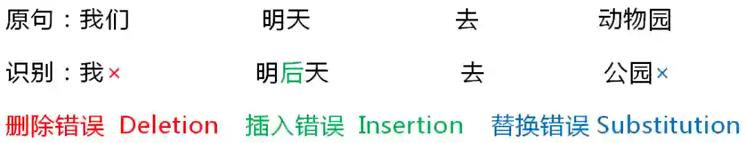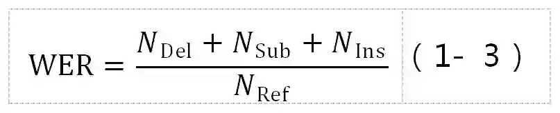 度量语音识别性能的指标有许多个,通常使用测试集上的词错误率 ( Word Error Rate,WER ) 来判断整个系统的性能,其公式定义如下: