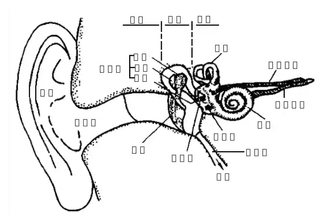 外耳包含耳翼和外耳道,耳翼的作用是保护耳孔,并具有定向作用。外耳道同其他管道一样也有共振频率,大约是3400 Hz。鼓膜位于外耳道内端,声音的振动通过鼓膜传到内耳。中耳由三块听小骨组成,作用包括放大声压和保护内耳。中耳通过咽鼓管与鼻腔相通,其作用是调节中耳压力。内耳的耳蜗实现声振动到神经冲动的转换,并传递到大脑。