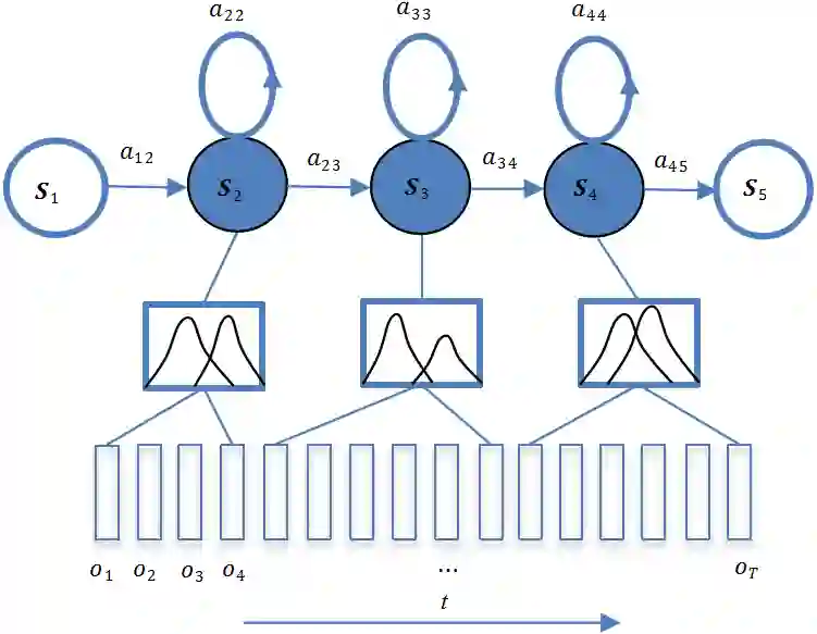 如图1-9所示,HMM包含S1、S2、S3、S4和S55个状态,每个状态对应多帧观察值,这些观察值是特征序列 ( o1、o2、o3、o4,...,oT ),沿时刻t递增,多样化而且不局限取值范围,因此其概率分布不是离散的,而是连续的。自然界中的很多信号可用高斯分布表示,包括语音信号。由于不同人发音会存在较大差异,具体表现是,每个状态对应的观察值序列呈现多样化,单纯用一个高斯函数来刻画其分布往往不够,因此更多的是采用多高斯组合的 GMM 来表征更复杂的分布。这种用 GMM 作为 HMM 状态产生观察值的概率密度函数 ( pdf ) 的模型就是GMM- HMM,如图1-9所示,每个状态对应的GMM由2个高斯函数组合而成。