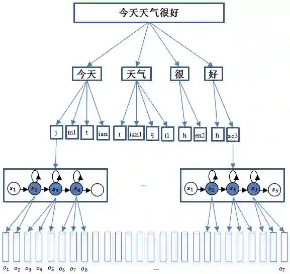 则"今天"的词HMM由"j"、"in1"、"t"和"ian1"四个音素HMM串接而成,形成一个完整的模型以进行解码识别。这个解码过程可以找出每个音素的边界信息,即每个音素 ( 包括状态 ) 对应哪些观察值 ( 特征向量 ),均可以匹配出来。音素状态与观察值之间的匹配关系用概率值衡量,可以用高斯分布或DNN来描述。