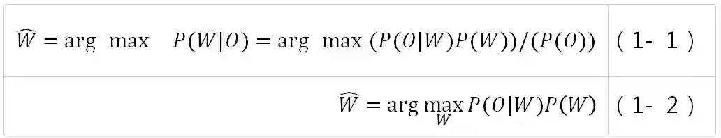 语音识别过程是个复杂的过程,但其最终任务归结为,找到对应观察值序列O的最可能的词序列W。按贝叶斯准则转化为: