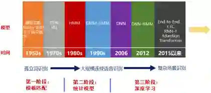 图1-7给出了语音识别技术的发展历史,主要包括模板匹配、统计模型和深度学习三个阶段。