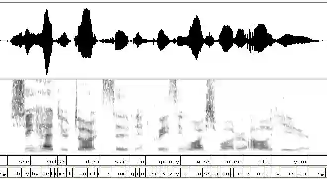 TIMIT——经典的英文语音识别库,其中包含,来自美国8个主要口音地区的630人的语音,每人10句,并包括词和音素级的标注。图1-13给出了一条语音的波形图、语谱图和标注。这个库主要用来测试音素识别任务。