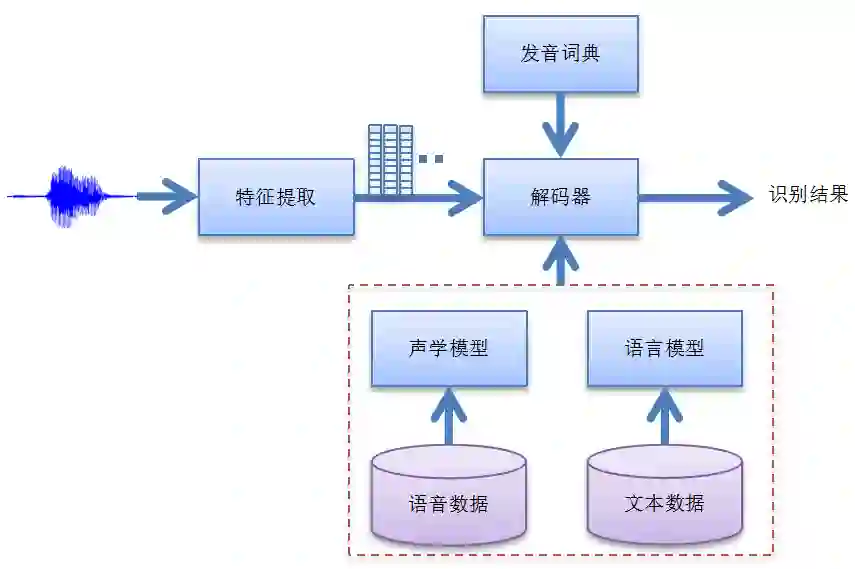 图1-4所示是典型的语音识别过程。为了让机器识别语音,首先提取声学特征,然后通过解码器得到状态序列,并转换为对应的识别单元。一般是通过词典将音素序列 ( 如普通话的声母和韵母 ),转换为词序列,然后用语言模型规整约束,最后得到句子识别结果。