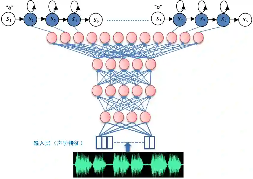 DNN的输出节点与所有HMM ( 包括"a"、"o"等音素 ) 的发射状态一一对应 ( 如图1-11所示 ),因此可通过DNN的输出得到每个状态的观察值概率。