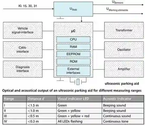 被动式主要利用超声波传感器+蜂鸣器+HMI图标来提示驾驶者外部障碍物情况,防止车辆在倒车时碰撞,一般由下面几个功能构成: