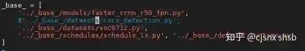 faster_rcnn_r50_fpn_1xcoco.py文件里面调用了三个文件,第一个是模型配置文件,第二个是数据集配置文件,后来两个是配置学习率,迭代次数,模型加载路径等等,我们把原来COCO_detection.py 修改成VOC0712.py 文件