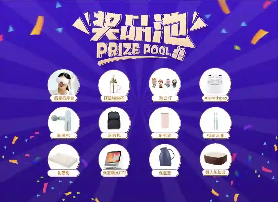 🎁 奖品:同等价值的电动牙刷/懒人抱枕桌/淘公仔/保温壶/充电宝/双肩包/运动水杯等。