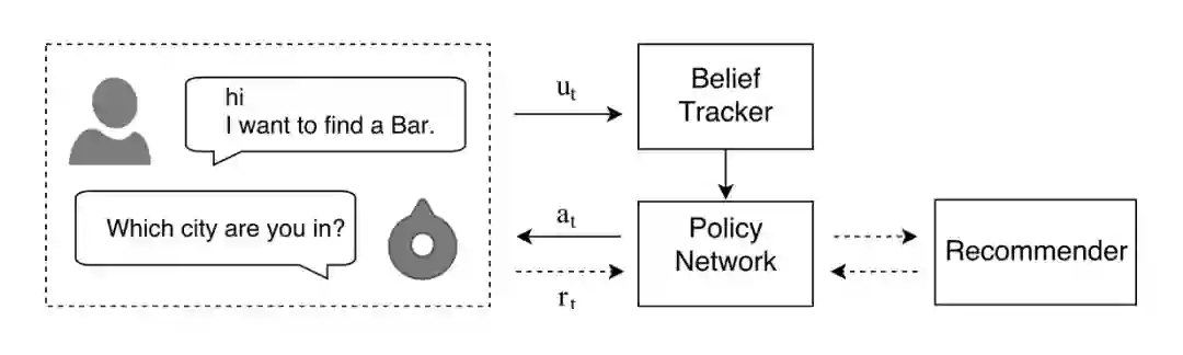 最后是策略模块,CRM 以用户置信 作为输入,经过简单的两层前馈神经网络直接得到了用户的动作预测。三个模块构成的对话推荐系统架构如下图所示。