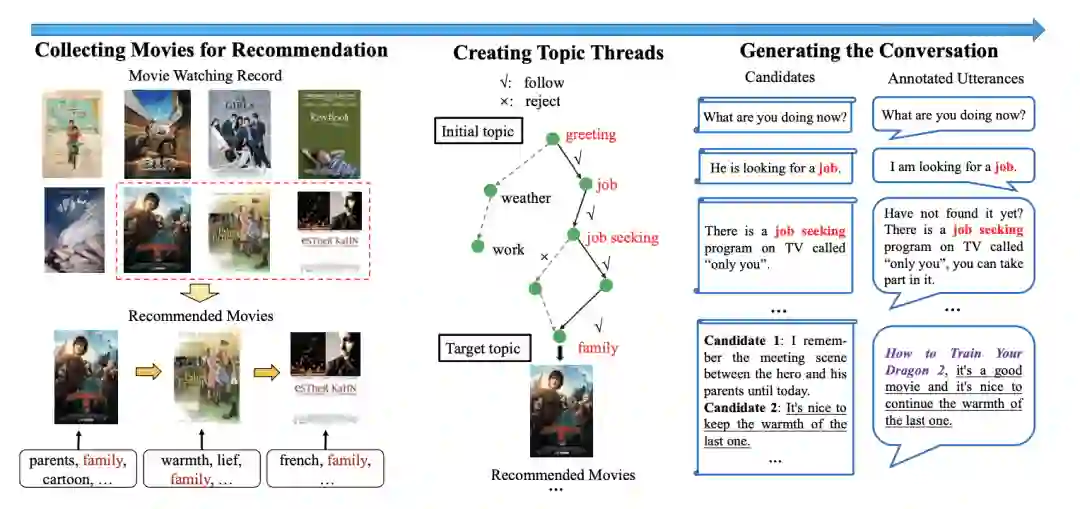 第一阶段是收集电影序列,对于某一用户可以从其观影记录中的电影构建若干子序列,其中每个序列的电影都有相同的话题标签;接着是构建话题转移的通道,作者借助深度优先搜索算法,在知识图谱 ConceptNet 上找到一条从最初话题(greeting)到目标电影话题的转移路径;最后是利用深度学习模型从话题生成对话文本,并进行人工修改和润色,以保证对话的流畅性。