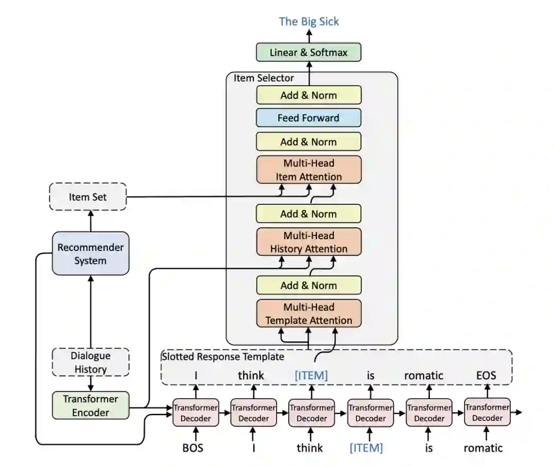 在对话的第 轮,推荐模块会根据一定的策略从物品集合 中选择一个候选物品子集 ,对话模块则需要生成当前轮次的回复文本 。值得注意的是,候选物品子集 可能为空,此时对话模块生成的是询问相关的文本,或者仅仅是闲聊文本。