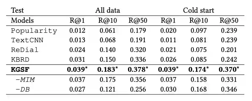 回顾整个模型,对话模块获得的文本中的实体信息对推荐产生促进作用,而推荐模块产生的用户 embedding 最终转化为 Vocabulary Bias 来促进对话的生成,使得对话词汇与场景更为相关。这种对话与推荐相互促进的结构也获得了相当不错的结果。