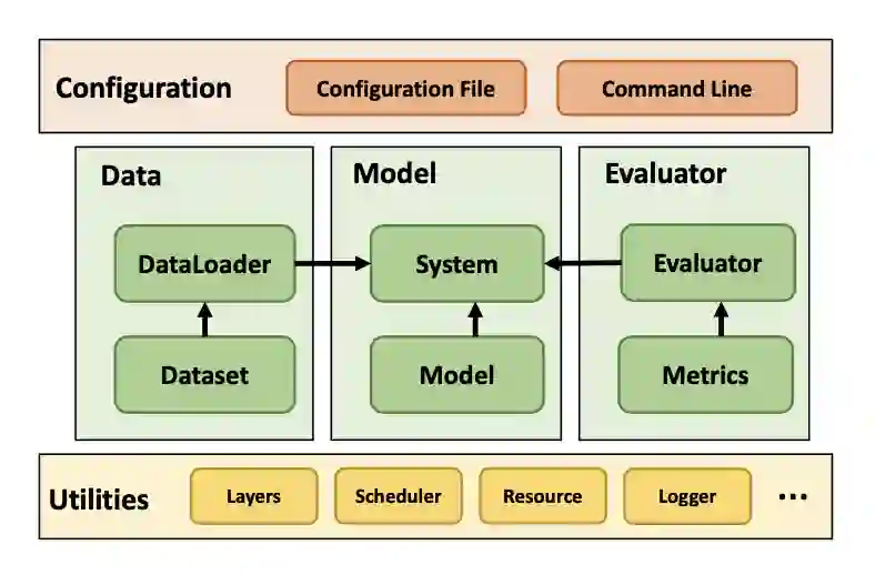 CRSLab 整体架构如上图所示,其采用数据与模型相分离的模式,使得预处理好的 6 个数据集和 5 个模型能够自由搭配,除了部分数据与模型不完全兼容的情况。CRSLab 还实现了常用的基准模型(Baseline)和便捷的自动化评测模块,使开发者能将更多的精力集中在模型的主要逻辑中。