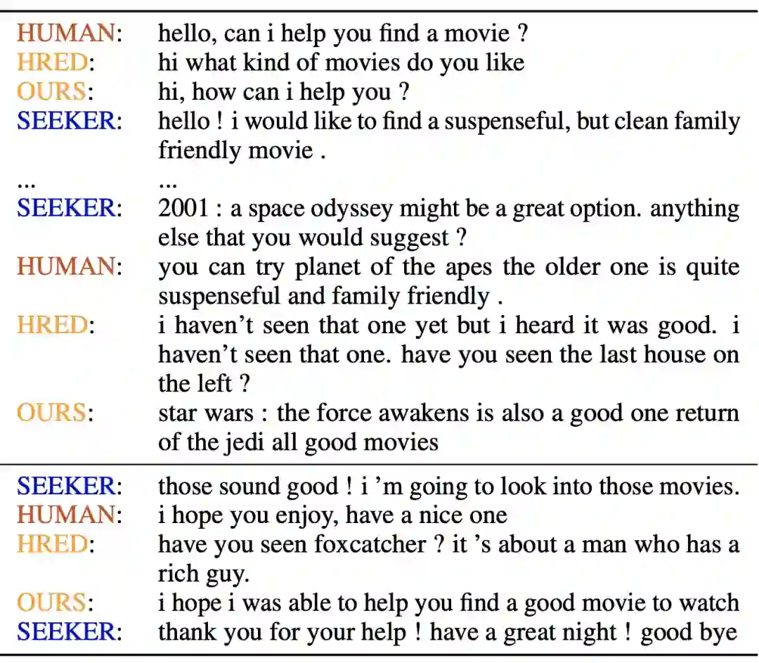 本节介绍的四个模型(除 TGReDial 外)都采用生成式对话推荐领域数据集 REDIAL 来进行训练和评测。这是由 Amazon Mechanical Turks 的工作人员在一定的指导下相互交谈得到的、电影场景下的对话推荐数据集。该数据集一个典型的对话例子如下图所示,HUMAN 是数据集中的电影推荐者,而 SEEKER 是数据集中的电影寻求者;HRED 和 OURS 是模型输出内容而非数据集原有数据。