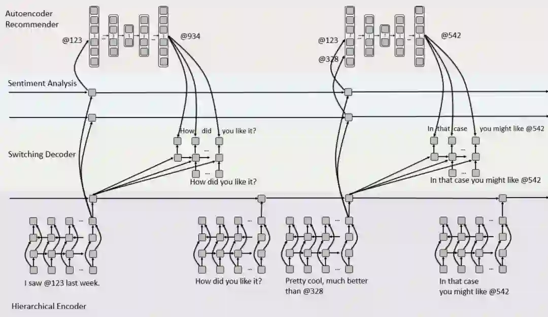 本文所提出模型的整体架构如上图所示。在对话模块一侧,使用了层次化的 RNN 架构 HRED 来编码对话,并采用了预训练的 Gensen 句子向量表示。HRED 得到对话的隐含向量表示之后,一方面会给情感分析 RNN 进行计算,一方面给 Switching Decoder 来将推荐结果融入到对话中,另外还能用于给 RNN 解码出回复语句。而在推荐模块一侧,模型采用了降噪自编码器,同时利用了情感分析模块的计算结果进一步修正推荐结果。训练时,推荐模块先在电影评分数据集 MovieLens 上进行预训练,而后才在 REDIAL 上进一步训练。