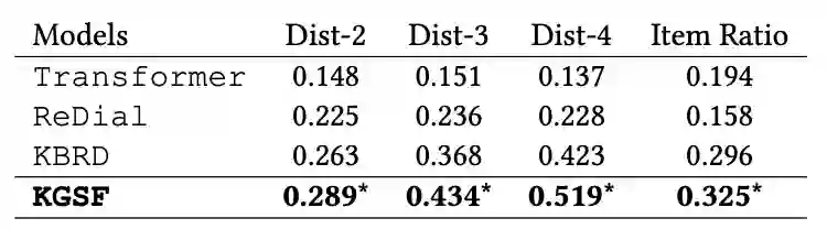 KGSF 与以往模型在推荐指标(召回率 Recall)和对话指标(多样性指标 Distinct 和 Item Ratio)上的比较如下面两张图所示。