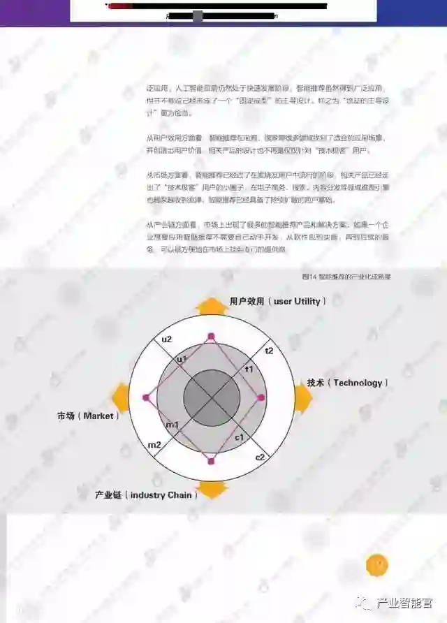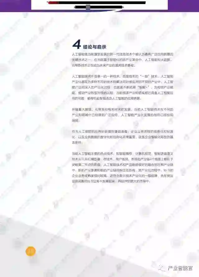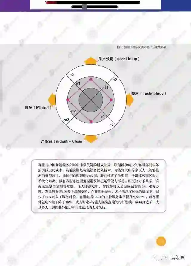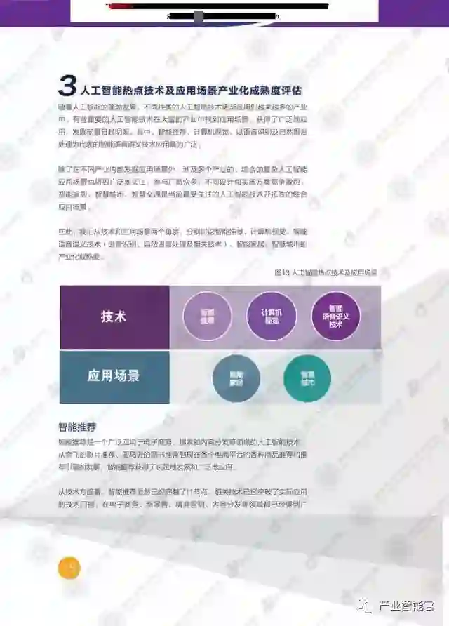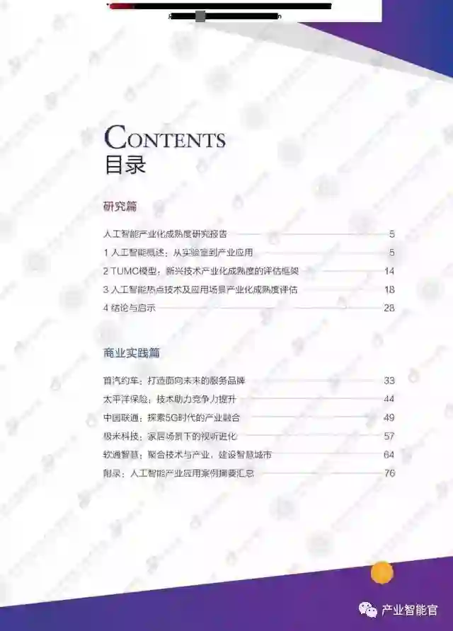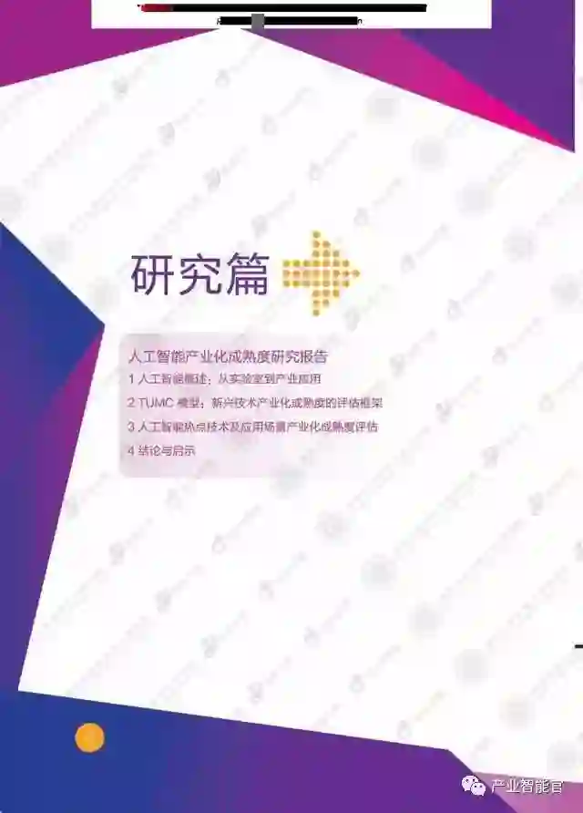 本研究分两大部分,第一部分讨论了人工智能的发展情况,并应用TUMC模型从技术和综合应用场景的角度考察了热点技术和场景的人工智能产业化成熟度。第二部分,通过企业的具体实践,分析了智能推荐、计算机视觉、智能语音语义技术等人工智能技术在智慧岀行、智能家居、智慧堿市、智能客服等实际应用场景中的产业化发展情况。这些商业实践基本覆盖了当前最重要的人工智能技术和综合应用场景。