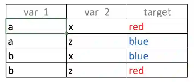 回到这个例子,同时拿两个变量,输入和输出之间一一对应:”如果var_1='a'而且var_2='x'那么target='red'是100%”。您也可以尝试其他组合。