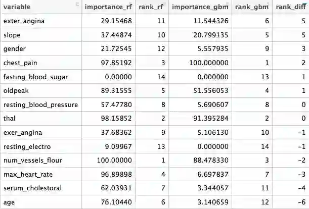 现在我们可以进行比较。 importance_rf和importance_gbm这两列代表着每个算法测量的权重。基于每个度量,有着代表权重序列的rank_rf和rank_gbm,最终rank_diff(rank_rf-rank_gbm) 代表每个算法对变量排序的不同。