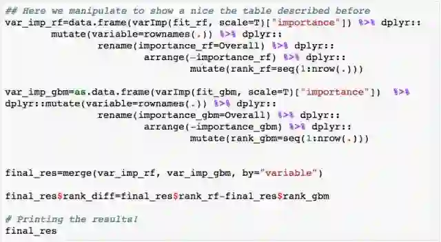我们将创建两个模型:随机森林和梯度提升机(GBM),使用R包caret来对数据进行交叉验证。如下,我们将比较每个模型返回的最佳变量排名。