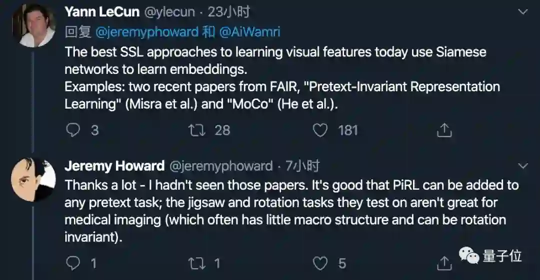 Jeremy Howard在发出这条Twitter之后,深度学习三巨头之一的Yann LeCun对其回复。