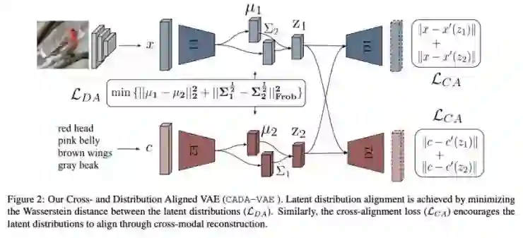 本文作者训练了两个变分自编码器(VAE),一个用于视觉特征,另一个则用于语义特征。其目的是能够根据潜在的视觉特征重建语义特征,反之亦然。作者表明,使得两个潜在空间具有相同的分布也很有帮助。