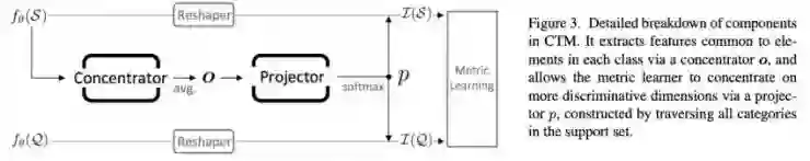 给定一个特征提取器,该模型大体上可以预测一个特征向量上的注意力映射。「Concentrator」会分别查看每个类(或图像),而「Projector」则会融合来自任务中所有类的信息来生成注意力映射。「Concentrator」和「Projector」都是通过一个小型的卷积神经网络(CNN)来实现的。我非常喜欢这种简单的模块,当在几个一致的基于度量的方法上使用该模块时,它们总是可以提升性能。