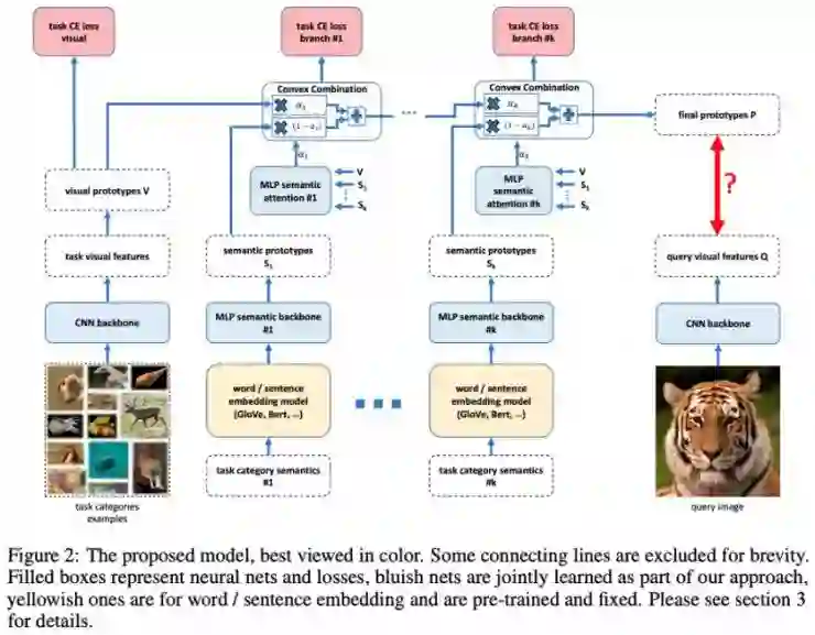 在这项工作中,标签嵌入(GloVe)被用来预测数据特征提取模型的权重。他们提出了一种很好的方法来分解权重,从而只需要预测一个较低维的权重向量。此外,通过「嵌入损失」迫使语义嵌入和视觉嵌入对齐。这篇论文的有趣之处在于,它结合了两种方法:元学习(基于任务来预测模型),以及利用语义信息(标签)。然而,对于小样本学习任务而言,似乎本文提出的模型稍微弱于现有的最佳方法。