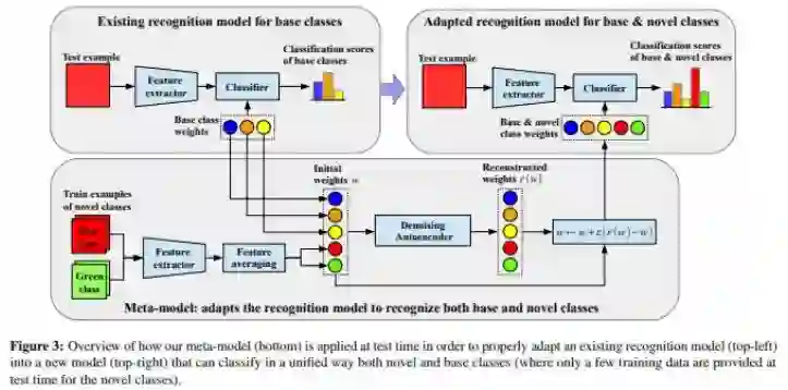 在本文中,作者再次建立模型预测分类器对于未见过的类的权重。此外,所有分类器的权重都会被传递给一个通过一个图神经网络实现的去噪自编码器(基类和任务中的新类别),从而做到:(1)让分类器能够适应当前任务的类别(2)将基类分类器的知识传播给新类分类器。使用去躁自编码器有助于修正预测得到的分类器,因为这些分类器仅仅只基于少量的示例预测得到,有明显的噪声。