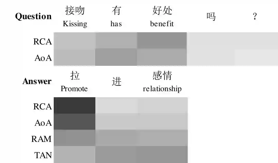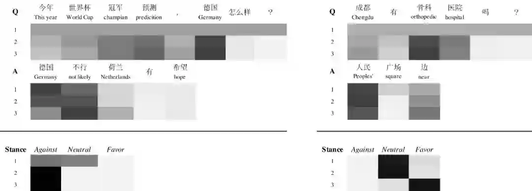 另外通过对Attention权重的可视化,我们可以看到不同模型在提取问题句和回答句语义的差别。这个例子中,只有RCA模型在判断立场类别时,能同时给问题句和回答句词合适的权重。