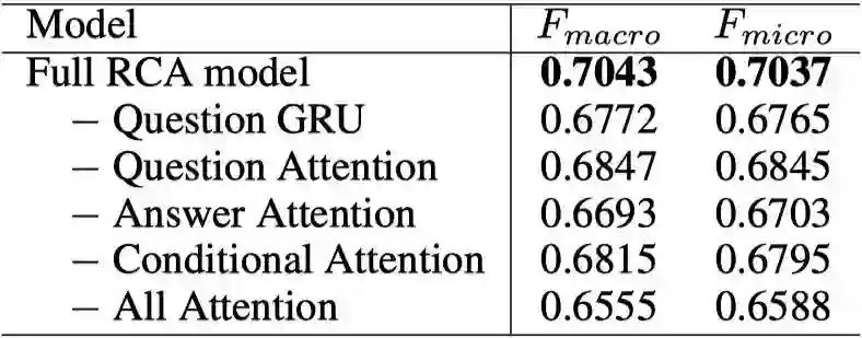 为了分析RCA模型各部分结构对于模型性能的影响,我们做了结构抹除测试。从表格中我们可以看出,问题句的表示对于模型性能影响很大;使用问题句信息从回答句中寻找重要的语义信息比用回答句从问题句提取信息来得更重要。