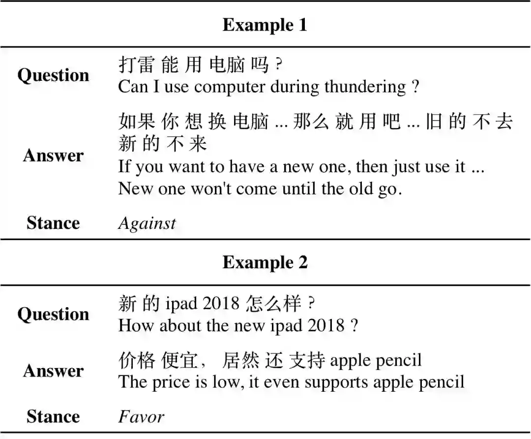 ,AnswerStance任务旨在判别回答句对于问题句的立场标签。例如,在图1的第2个例子中,回答句通过肯定“iPad 2018的定价”来表达favor立场。