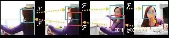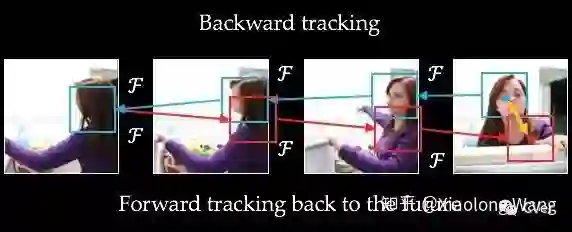 如下图所示,假设我们用这个network进行tracking。在最后一帧上,我们首先随机选一个起bounding box,然后对这个bounding box进行backward tracking(蓝色箭头),接着对在第一帧的结果进行forward tracking(红色箭头)。那么initial box和最后的tracking box之间的error(黄色箭头)就会作为我们训练network的supervisory signal。我们把这个signal称为Cycle-Consistency Loss。