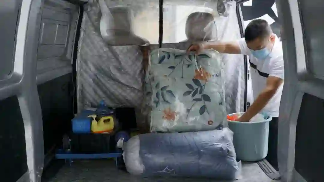 图片说明:林师傅出车都会在车厢备好被子、桶等生活物品