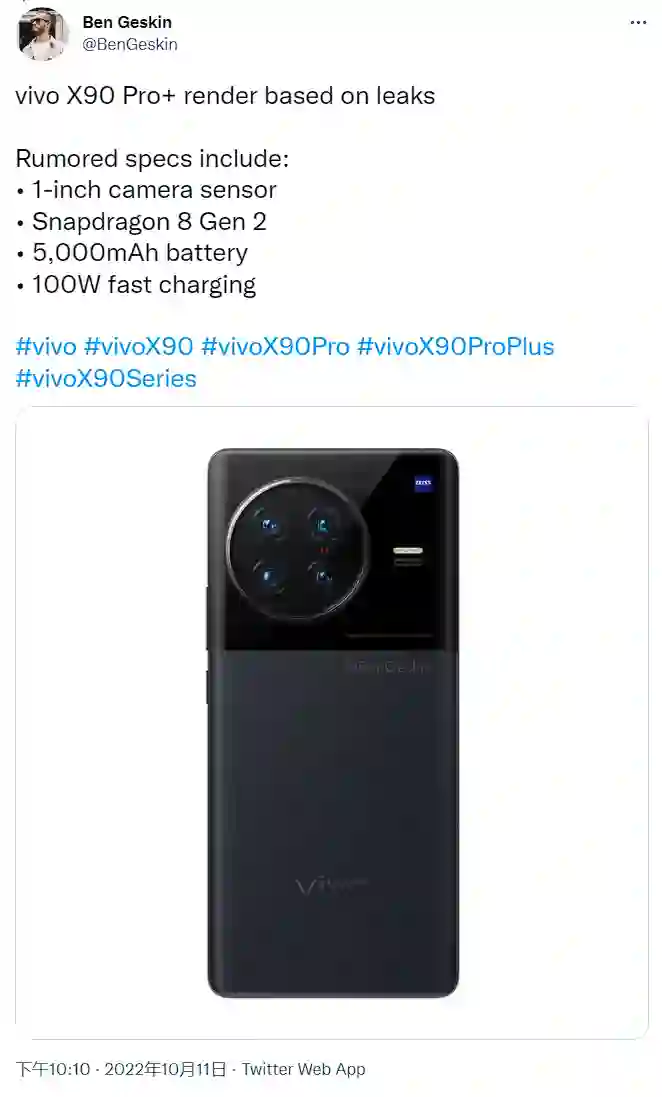 此外,爆料达人 Ben Geskin 也已依据爆料信息,制作了 vivo X90 Pro+ 的渲染图。vivo X90 Pro+ 采用后置四摄,四个镜头均匀分布在一个大的圆形中,包括一个潜望式长焦摄像头,蔡司小蓝标与闪光灯位列正右方。