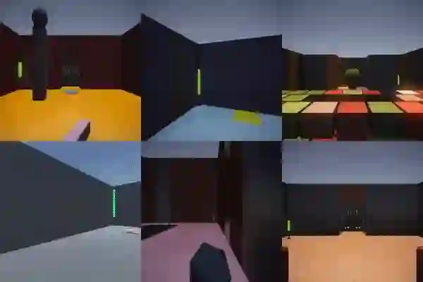 每个场景中包含2种元素:1间由天花板、墙壁和地板组成的空房,最多六个物体,并且颜色随机、样式随机。训练集大小为7GB,测试集在6-8MB之间。