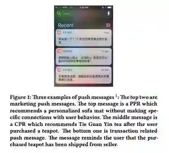 这篇文章中,我们对电商领域营销推送场景进行点击率的优化。营销推送场景和传统电商推荐场景有很多类似的地方,但也有所不同。首先,营销推送的点击率受文案影响很大,和用户直接相关的文案的点击率会明显高于通用的推送文案;其次,每次营销推送只有一个展示坑位,因为对推送商品的准确度要求更高。