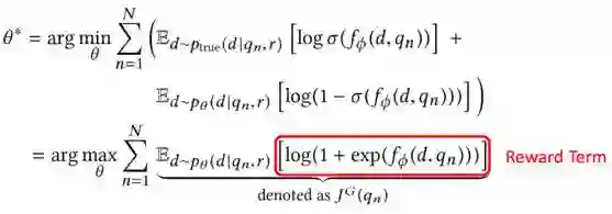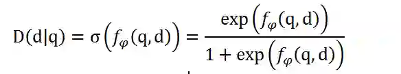 Discriminator:f_φ (q,d),其中,φ是D的参数。D的输入时Query-Document对数据(q,d),而输出则是这对数据是否匹配。这相当于一个二分类问题,可以通过logistic regression给出: