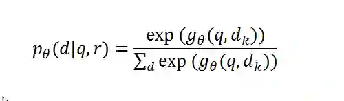 Generator:p_θ (d|q,r),其中,θ是G的参数。G的输入时Query,输出是与Query相关的documents的概率分布,相关性即由这个概率分布表示。p_θ (d|q,r)由Softmax函数给出: