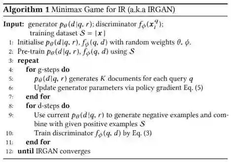 对IRGAN的training部分,G和D交叉进行更新。对于D,可以采用梯度下降更新法;对于G,由于G的输出是离散documents的概率分布,没办法直接采用梯度下降的方法求G的梯度,针对这种使用GAN训练离散数据的问题,可以采用强化学习中Policy Gradient的方法,reward由D给出。整个训练过程如下图算法所示: