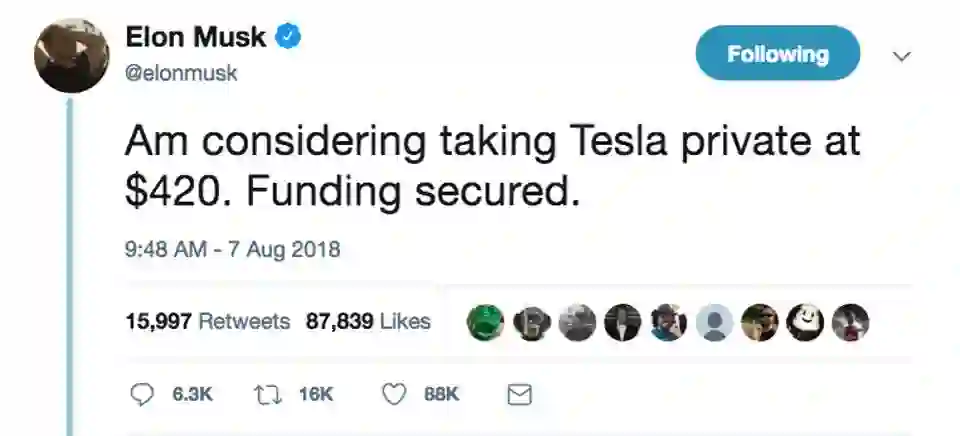 此前,马斯克在推特上宣布“私有化资金已到位”但最后又放弃私有化,遭到美国证券交易委员会起诉,指控其涉嫌证券欺诈和误导投资者。证交会方面称,“事实上,马斯克甚至没有与任何潜在资金来源方讨论,更不确定关键交易条款,包括收购价格。”