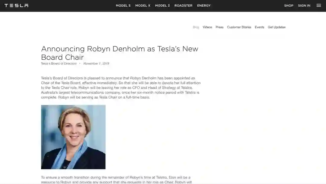 以下为特斯拉官网任命独立董事 Robyn Denholm出任董事长声明全文: