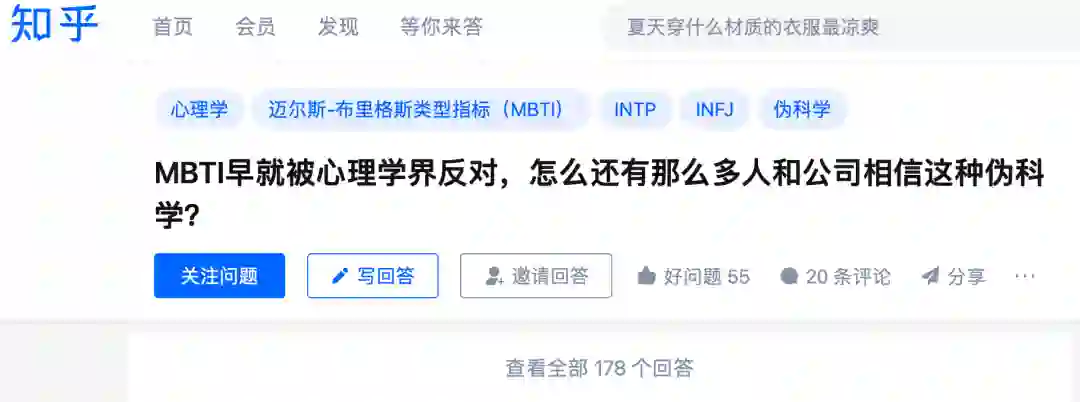 史嘉鑫是社会心理学博士,也经常出没在社交媒体上。疫情期间,有关心理、情绪的话题经常成为网络热点,但他对流量的态度一直保持谨慎,直到看到 MBTI、九型人格这种被心理学学术界批评的所谓“心理测试”,在年轻人朋友圈里开始流行起来的时候,他忍不住自己写了一篇文章,从科学角度指出 MBTI 的低信度。当 MBTI 的问题出现在知乎热榜上的时候,史嘉鑫顺手把这篇内容发布了上去,很快占据了这个问题下的榜首位置。