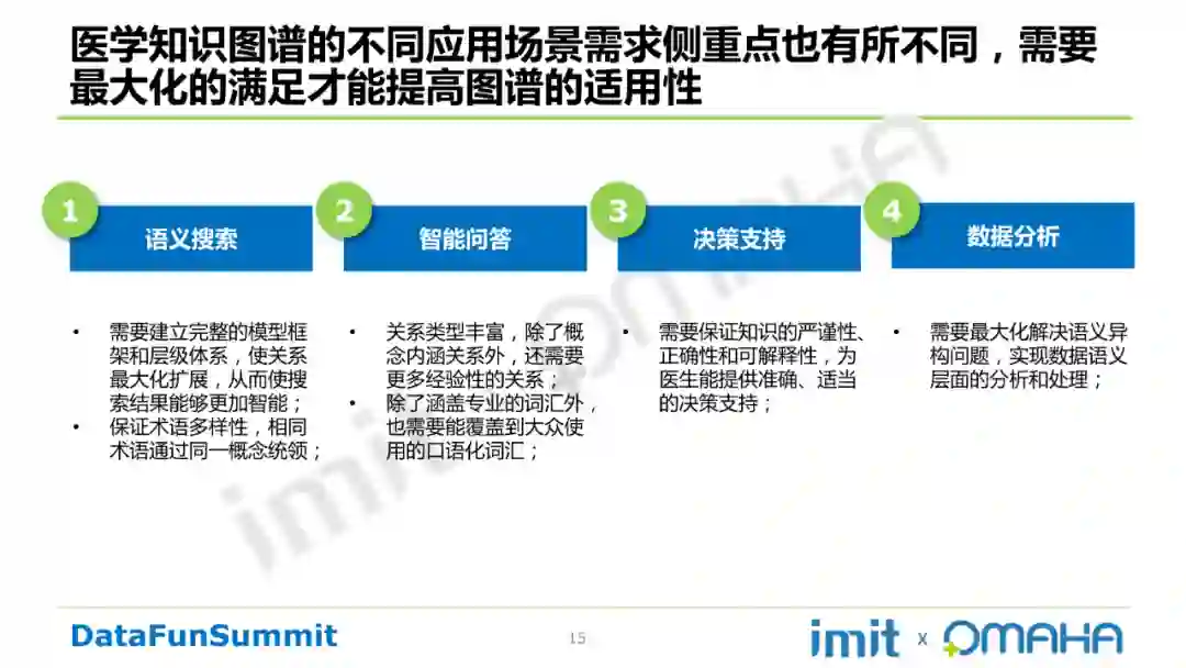 医学知识图谱的不同应用场景需求侧重点也有所不同,需要最大化的满足才能提高图谱的适用性。如下所示: