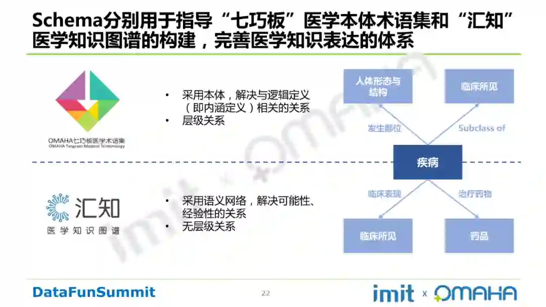 Schema分别用于指导“七巧板”医学本体术语集和“汇知”医学知识图谱的构建,完善医学知识表达的体系。我们之所以在一个模型指导下构建两个知识库,是为了解决不同的问题。“七巧板”采用本体解决与逻辑定义(即内涵定义)相关的关系,以及层次关系。“汇知”采用语义网络解决可能性、经验性的关系,并且无层次关系。具体请看下图: